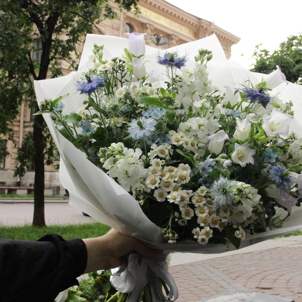 Нигелла – 7 шт.Кампанула – 5 шт.Маттиола – 7 шт.Матрикария – 7 шт.Твидия – 5 шт.Фисташка – 3 шт.Дизайнерская упаковка – 2 шт.Лента атласная – 3 шт.