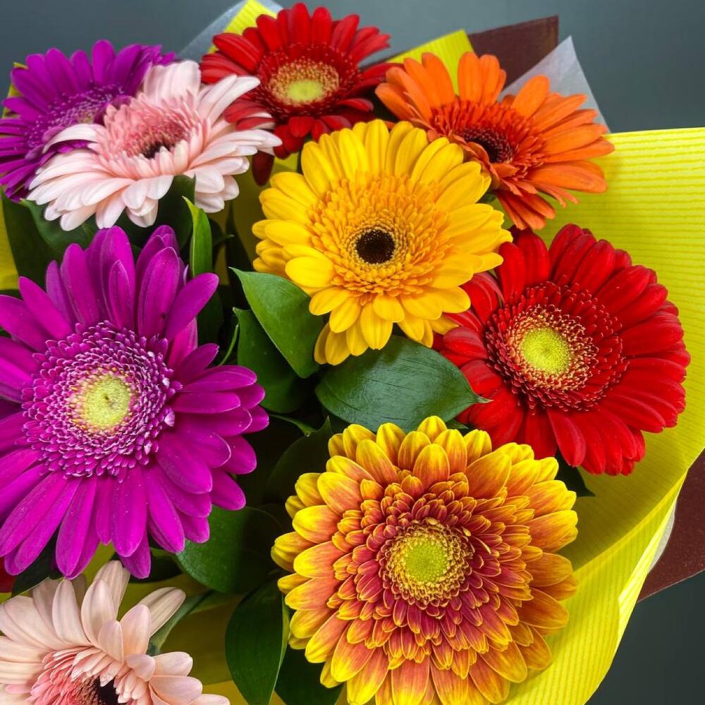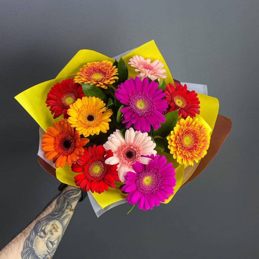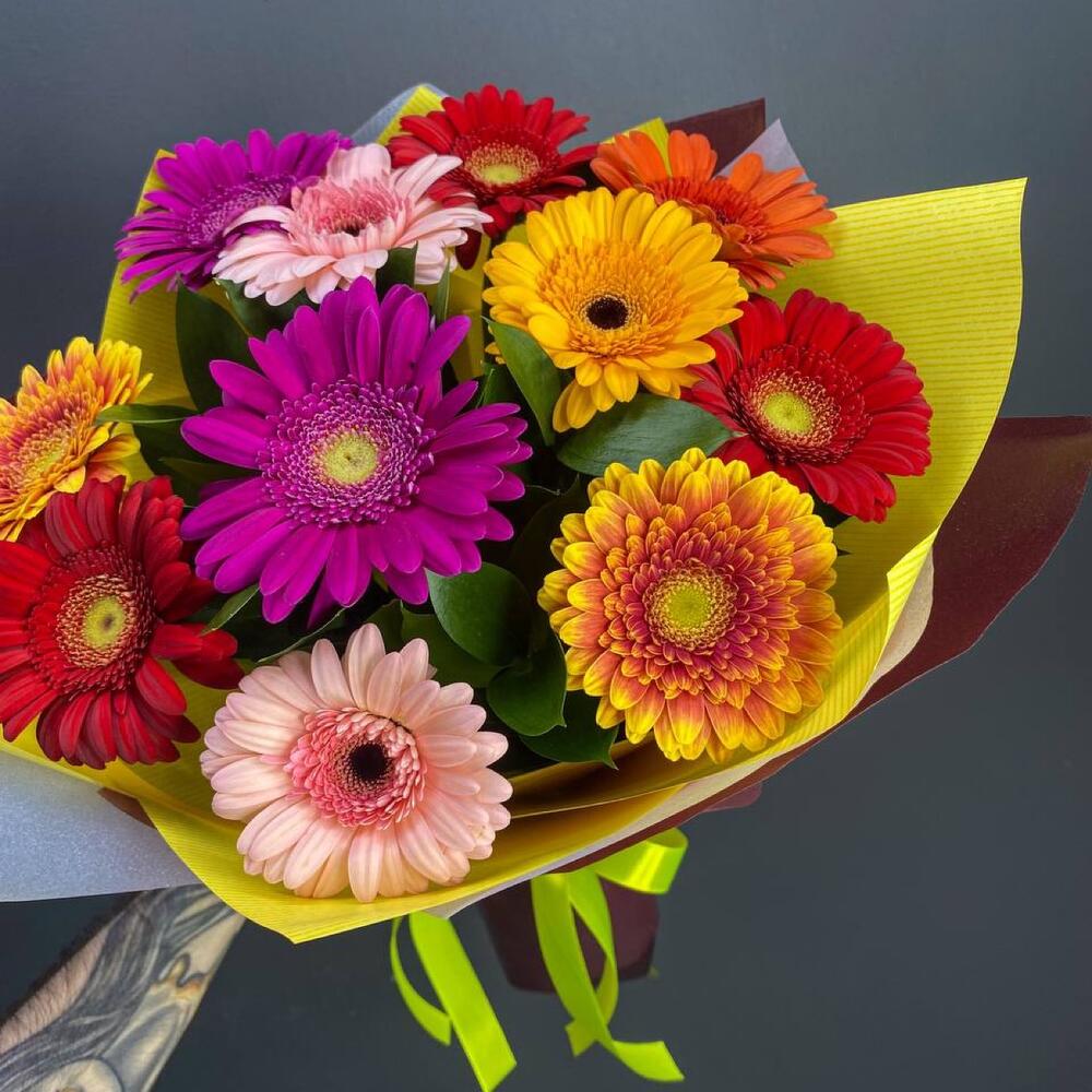 Рускус – 8 шт.Лента атласная – 1 шт.Гербера – 11 шт.Упаковка дизайнерская – 1 шт.