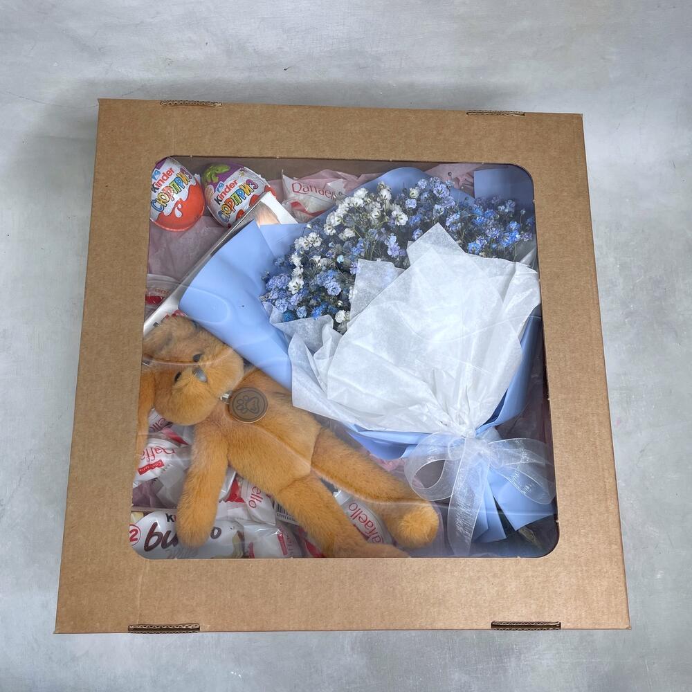 Гипсофила – 3 шт.Упаковка – 1 шт.Kinder bueno – 1 шт.Kinder сюрприз – 2 шт.Kinder chocolate – 1 шт.Raffaello конфеты – 10 шт.коробка крафт с окошком – 1 шт.игрушка зайчонок lapkin – 1 шт.