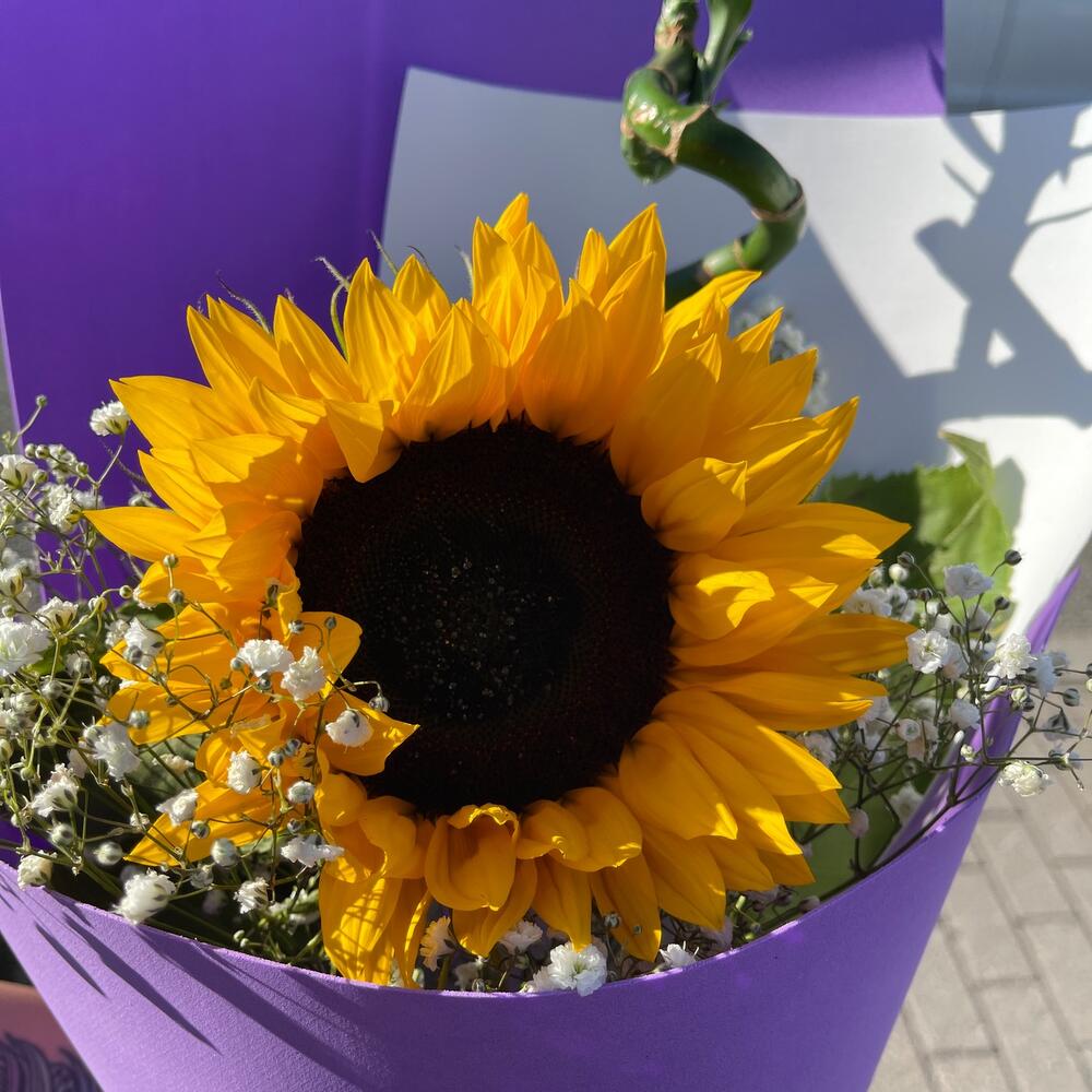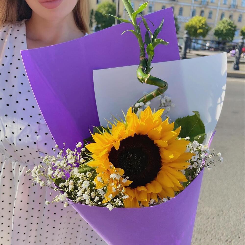 Подсолнух – 1 шт.Бамбук – 1 шт.Гипсофила – 1 шт.Фоамиран (упаковка) – 1 шт.бумага матовая – 1 шт.Лента – 1 шт.
