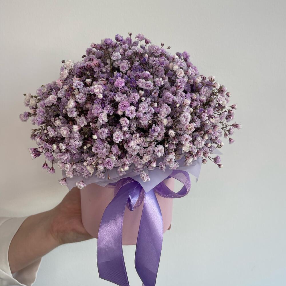 Нежная фиолетовая гипсофила в шляпной коробке как из Алиса в стране чудес Подарит самые чудесные и прекрасные чувстваУважаемые покупатели! Пожалуйста обратите ваше внимание на размер композиции при заказе! Он учитывается вместе с упаковкой Чтобы наши прекрасные композиции дольше радовали получателя рекомендуем вам:⭐Не вынимать цветы из коробки/корзинки⭐Поливать композицию каждый день (воду нужно вливать в центр, чтобы вода правильно распределилась) ⭐Не ставить цветы у отопительных приборов и на сквозняке