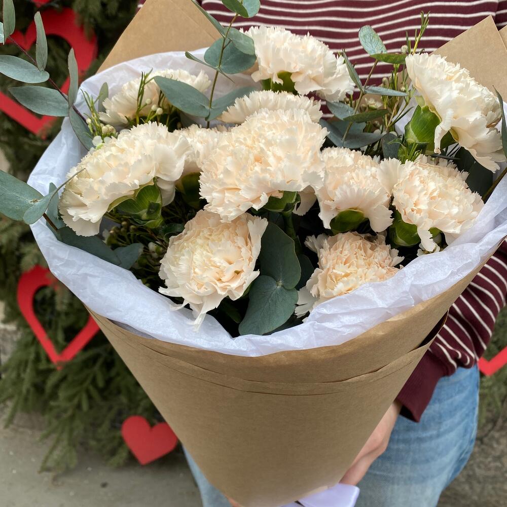 Диантус – 9 шт.Эвкалипт – 5 шт.Упаковка дизайнерская – 1 шт.