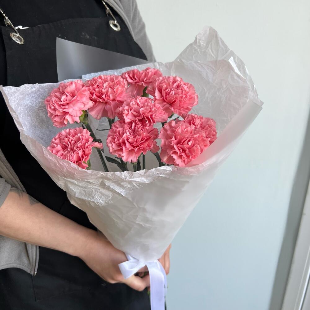 Лента атласная – 1 шт.Диантус – 9 шт.Матовая пленка – 2 шт.Тишью белое – 2 шт.