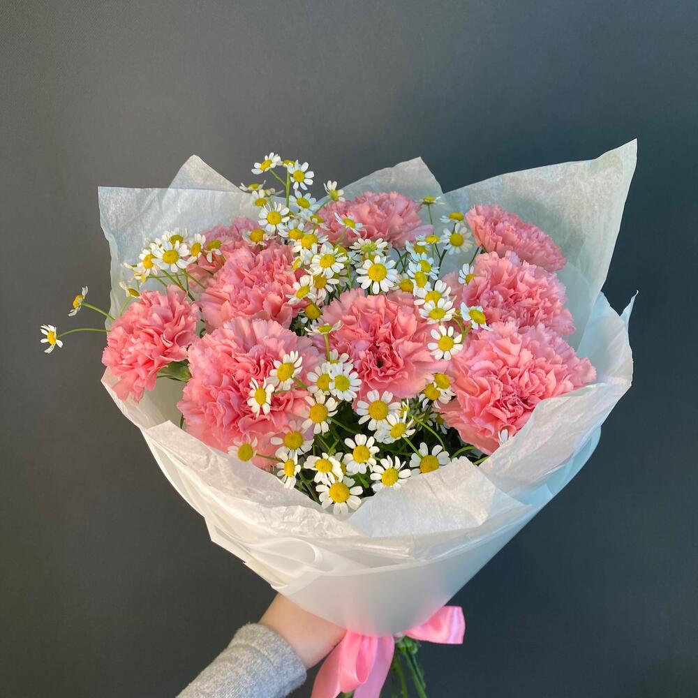гвоздика розовая диантус – 9 шт.ромашка кустовая танацетум – 3 шт.зелень декоративная ветка – 1 шт.Упаковка дизайнерская – 5 шт.
