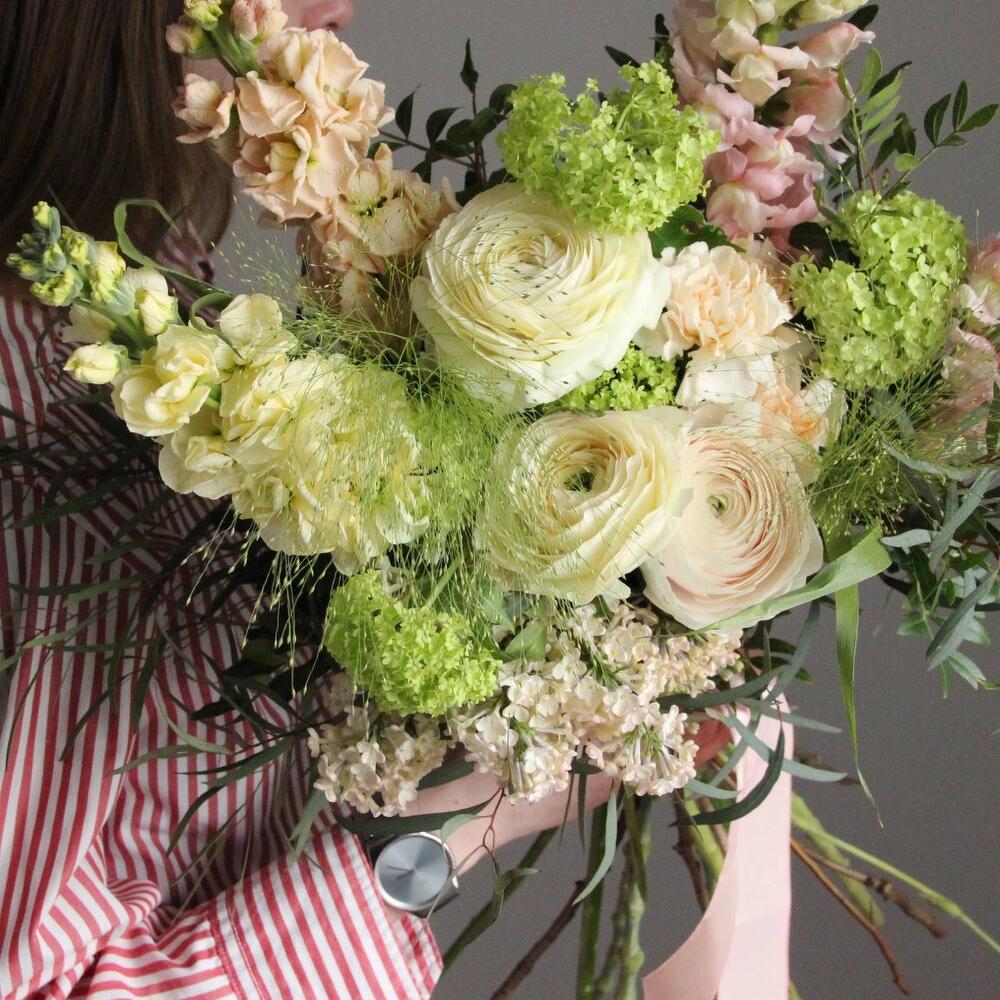 Вибурнум – 2 шт.Лента – 1 шт.Маттиола – 2 шт.Паникум – 2 шт.Сирень – 1 шт.Эвкалипт – 5 шт.Гвоздика – 3 шт.Ранункулюс – 3 шт.Львиный зев – 3 шт.