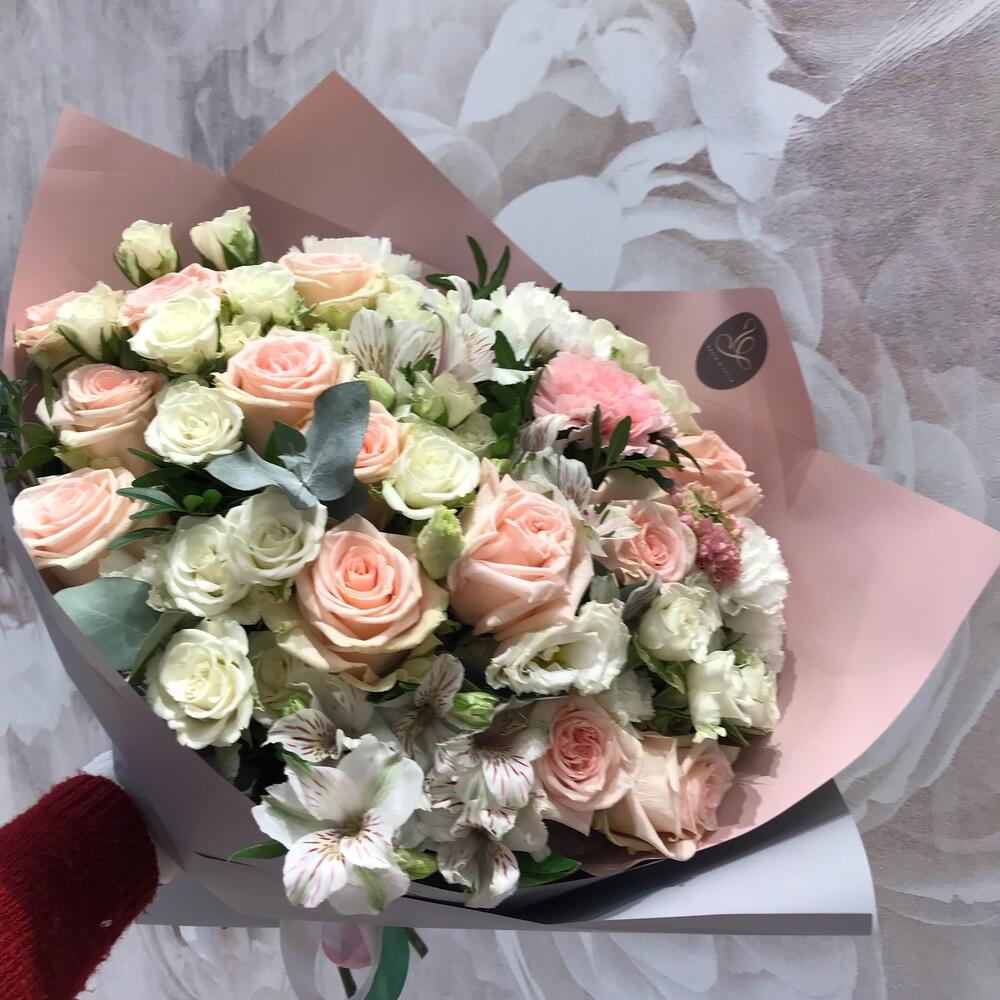 мондиаль роза – 12 шт.Кустовая роза – 5 шт.Альстромерия – 3 шт.Лизиантус – 3 шт.Гвоздика сортовая – 7 шт.