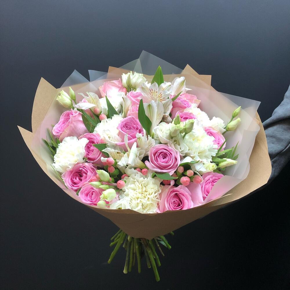Роза – 17 шт.Диантус – 6 шт.Лизиантус – 3 шт.Альстромерия – 3 шт.Фисташка – 5 шт.Крафт – 1 шт.Гиперикум – 5 шт.