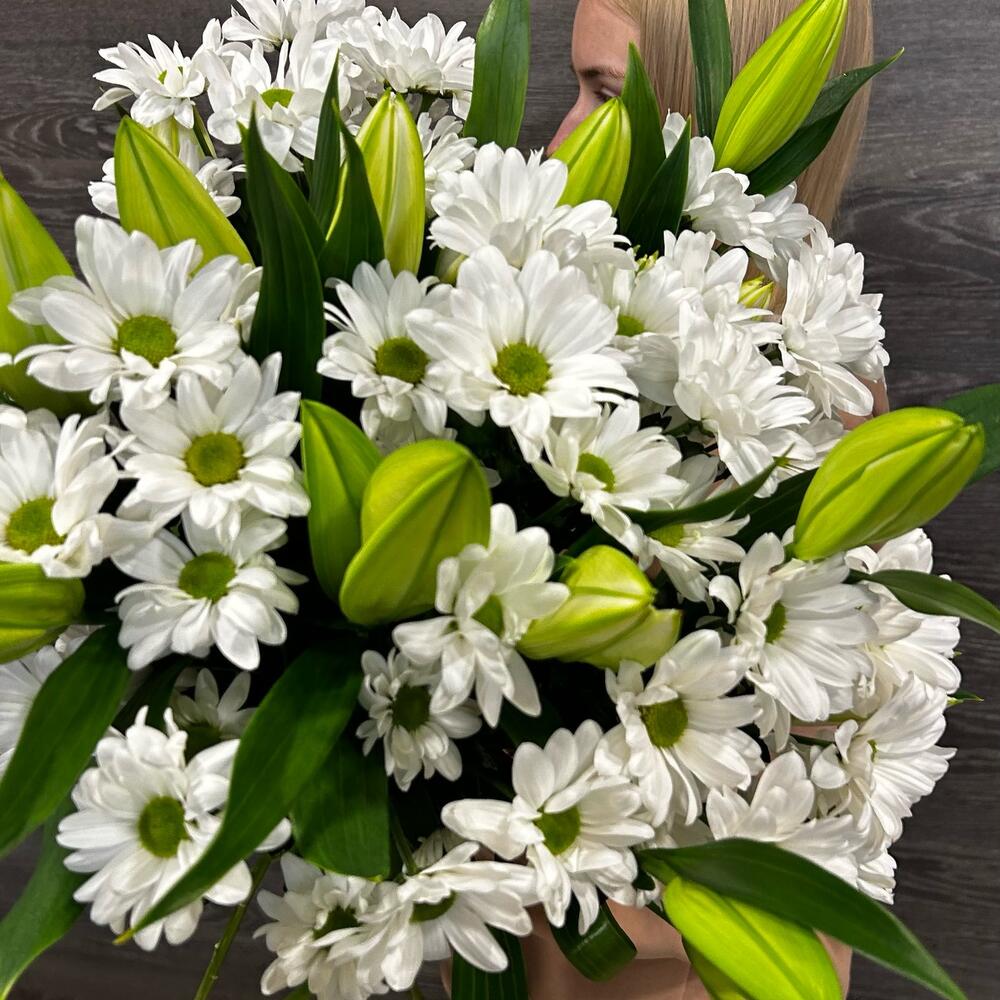Букет из белой кустовой хризантемы и ароматной белой лилии