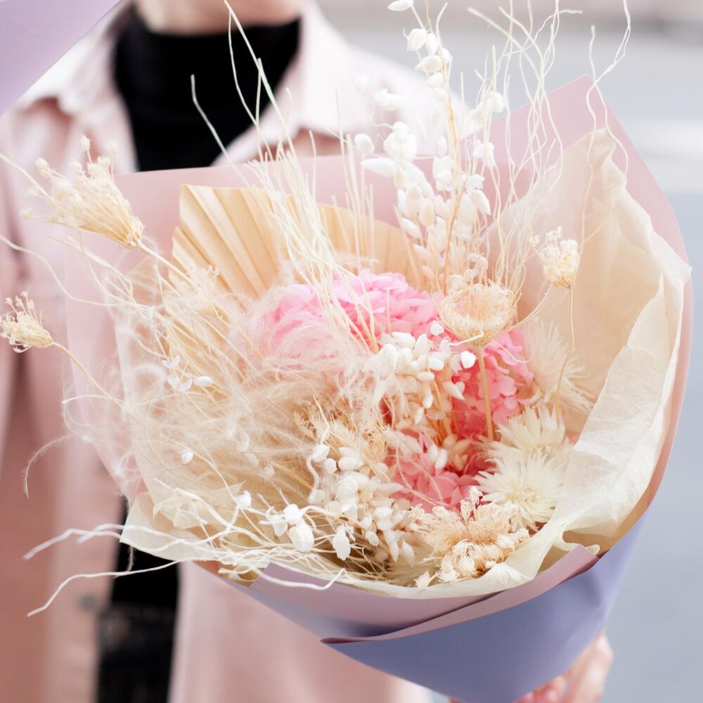 Упаковка дизайнерская – 1 шт.Ковыль – 30 шт.Ячмень – 20 шт.Гелихризум – 5 шт.гортензия стабилизированная – 1 шт.пальма сухоцвет – 1 шт.амми маус сухоцвет – 8 шт.
