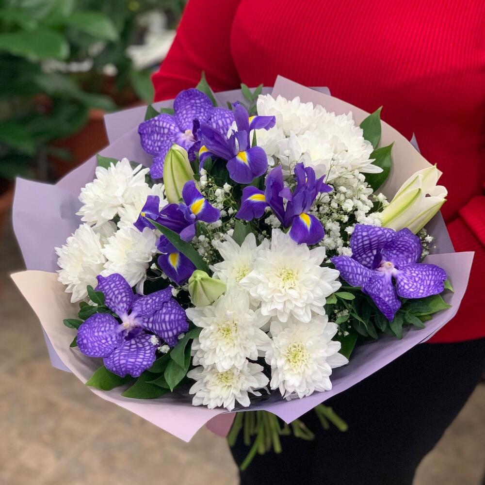 Лилия – 1 шт.Ванда – 3 шт.Хризантема кустовая – 3 шт.Ирис – 3 шт.Фисташка – 1 шт.Рускус – 10 шт.Упаковка дизайнерская – 1 шт.Лента атласная – 1 шт.