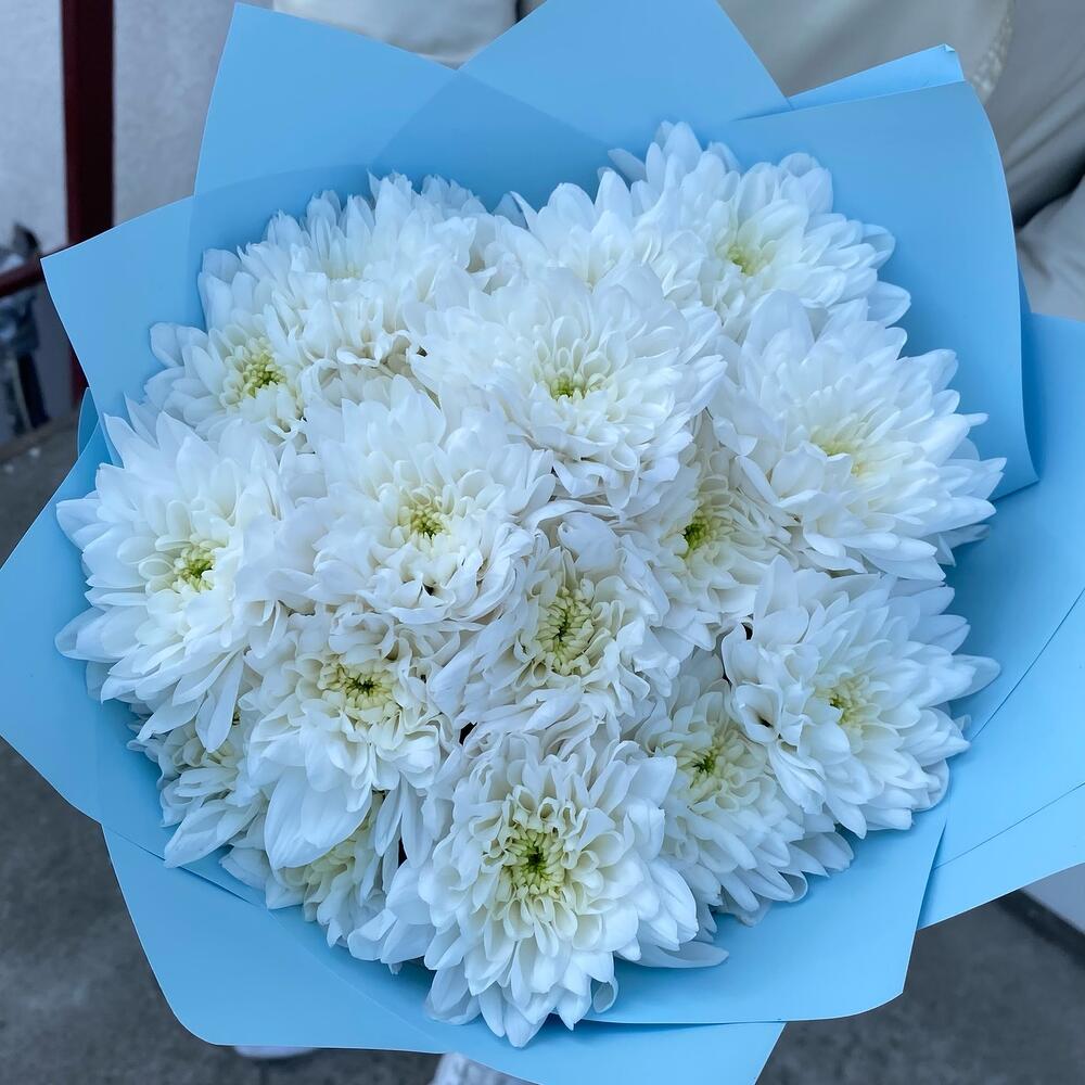 Хризантема кустовая – 5 шт.Лента атласная – 1 шт.Упаковка дизайнерская – 1 шт.