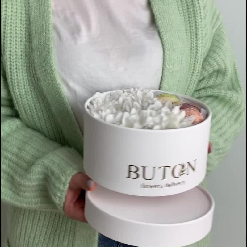 Хризантема кустовая – 2 шт.Тишью – 1 шт.Оазис флористический – 1 шт.макарон (пирожное) – 4 шт.цилиндр 21 см – 1 шт.