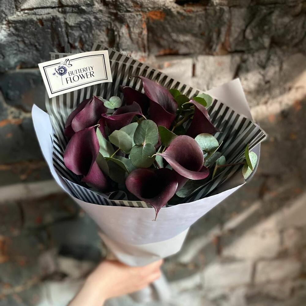 Букет из 9 черных калл с эвкалиптом в упаковке “Агостина”