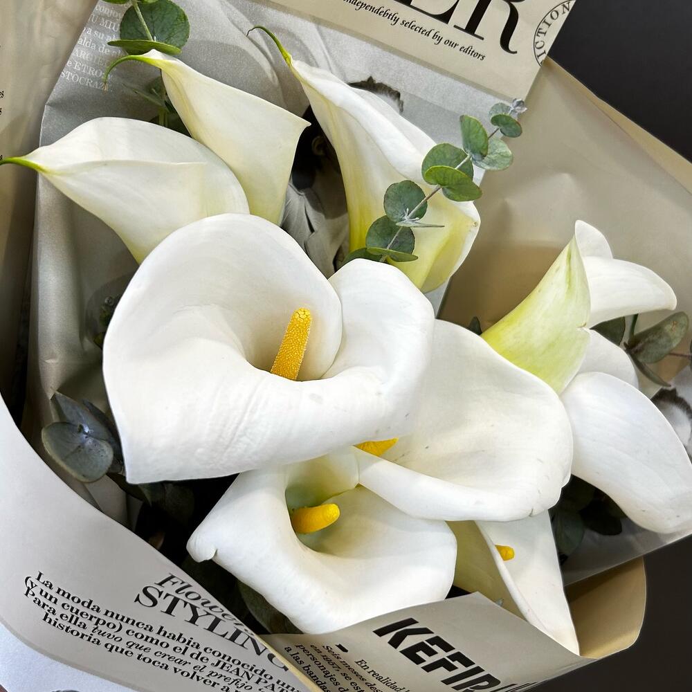 Букет из белой каллы и ароматного эвкалипта в упаковке