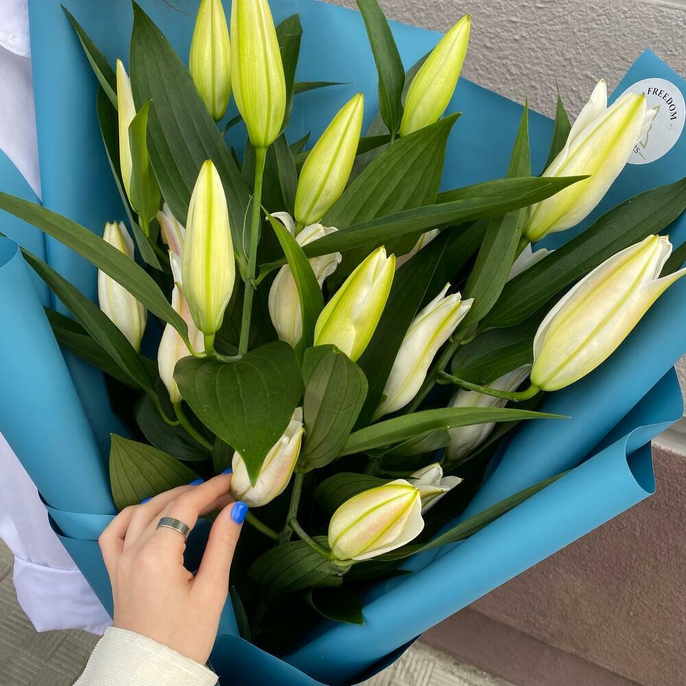 Лента атласная – 2 шт.Лилия белая – 5 шт.Упаковка дизайнерская – 5 шт.