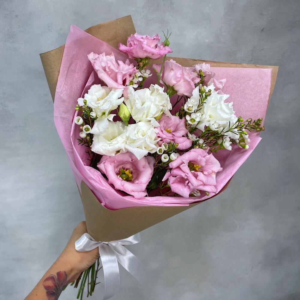 Лизиантус – 3 шт.Ваксфлауэр – 2 шт.Упаковка тишью – 1 шт.Упаковка крафт – 1 шт.Лента атласная – 1 шт.
