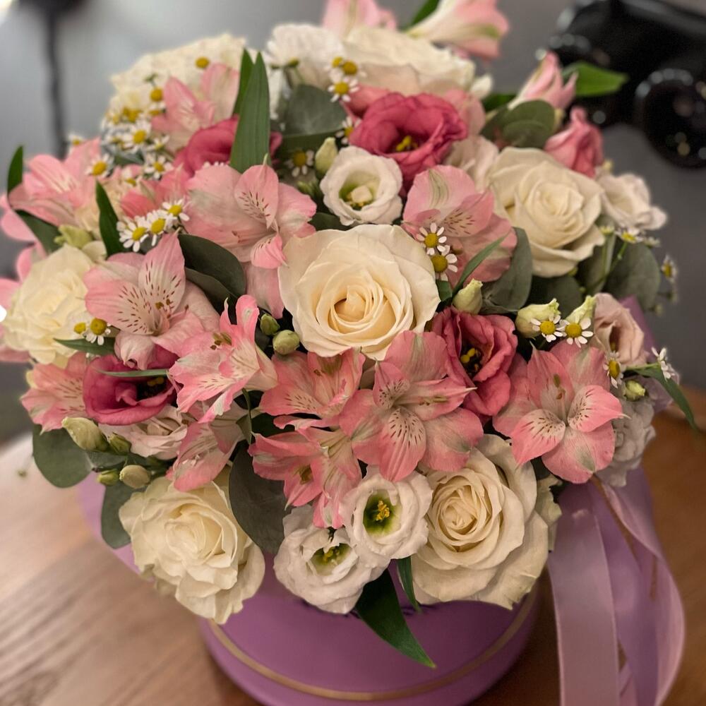 Стильная коробочка на день рождения или просто так, нежные цветы в коробке идеальное решение , для тех , кто не знает , что подарить. Цвет коробки может быть другими, по желанию изменен состав. Мы подпишем открытку и вовремя доставим адресату.