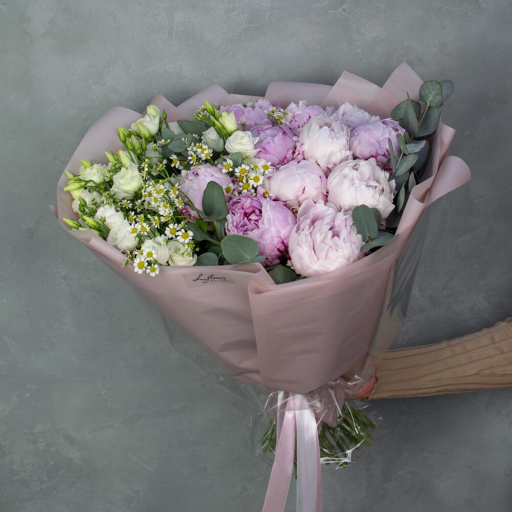 Матрикария – 7 шт.Лизиантус белый – 5 шт.Эвкалипт цинерея – 3 шт.пионы сара бернардт – 11 шт.