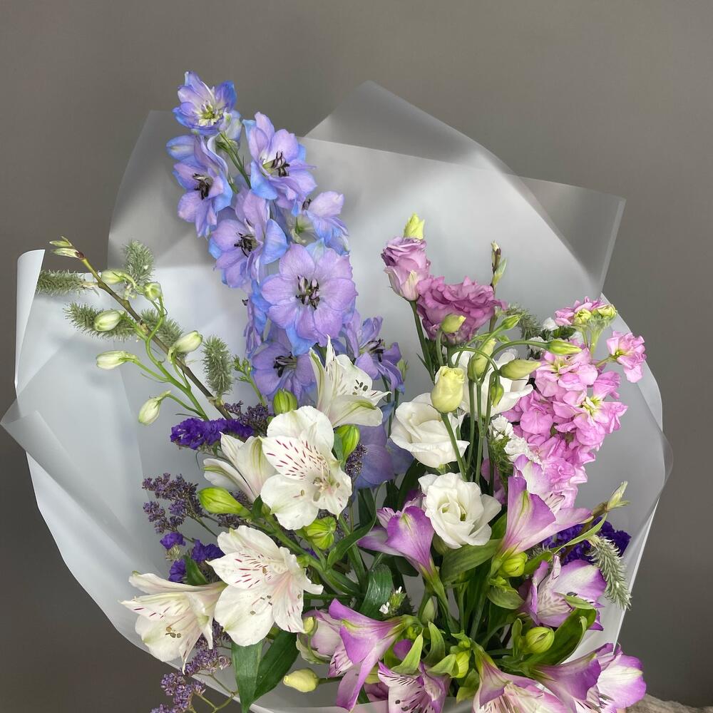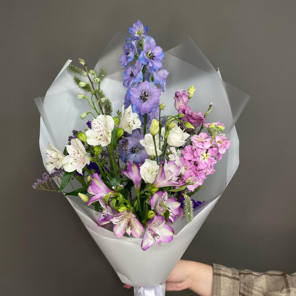 Весенний, нежный, звонкий букет. Воздушный и яркий. Красивые сиреневые тона очень романтично напоминают закатное небо.Большой синий дельфиниум создает акцент.