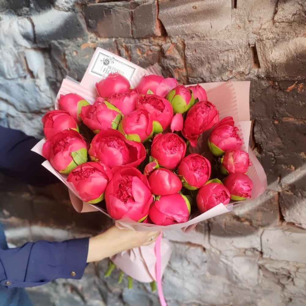 Букет из 23 ярко-розовых пионов в дизайнерской упаковке “Сьюзи Кью”