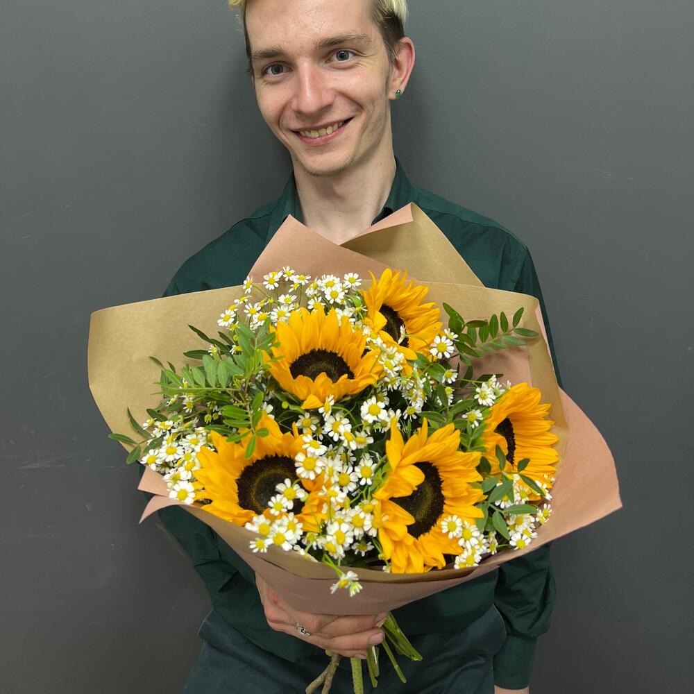 АНАСТАСИЯ солнечный букет из подсолнухов и ромашек