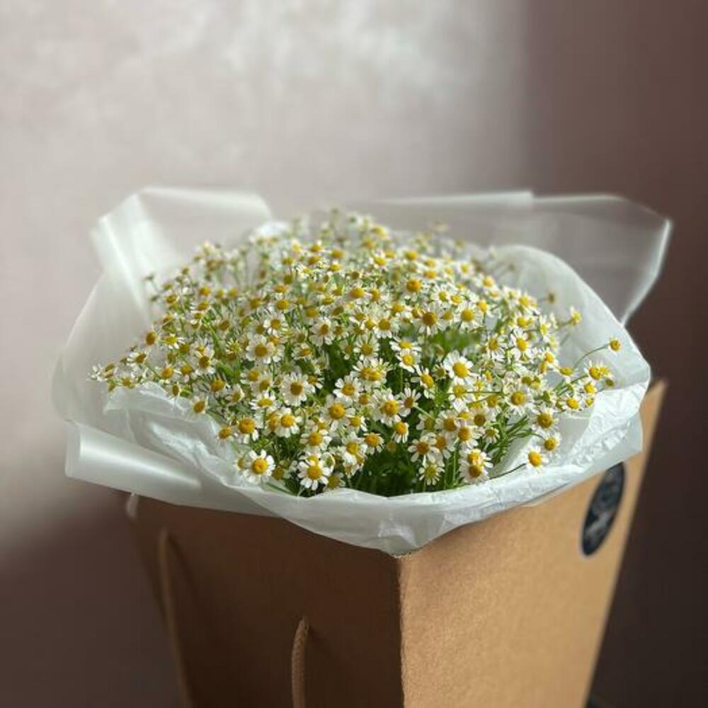 Атласная лента – 1 шт.Ромашка (матрикария) – 11 шт.декоративная упаковка – 2 шт.