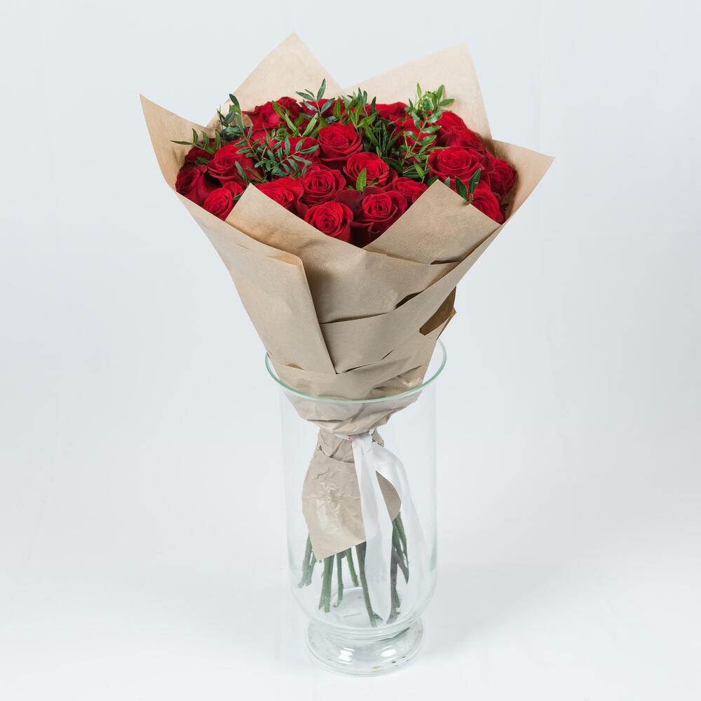 25 роз explorer PREMIUM 50 см в крафте с зеленью