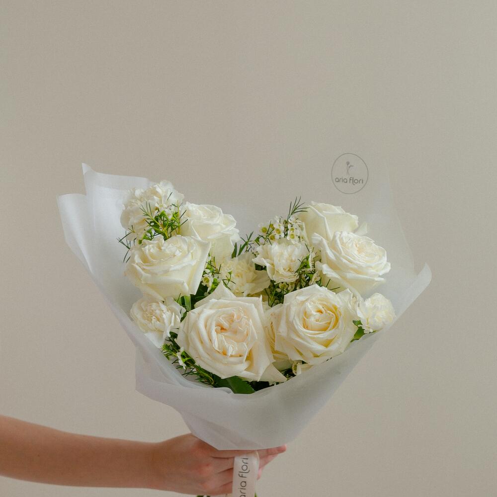 Роза Эквадор – 7 шт.Матрикария – 3 шт.Хамелациум – 1 шт.Упаковка дизайнерская – 1 шт.Гвоздика одноголовая – 5 шт.подкормка для срезанных цветов – 1 шт.любовь флориста – 100 шт.медиант ручной работы – 1 шт.советы по уходу за срезанными цветами – 1 шт.