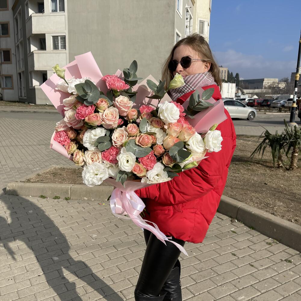 Альстромерии, Гвоздики, Кустовые розы, Лизиантусы, Розы, Хризантемы