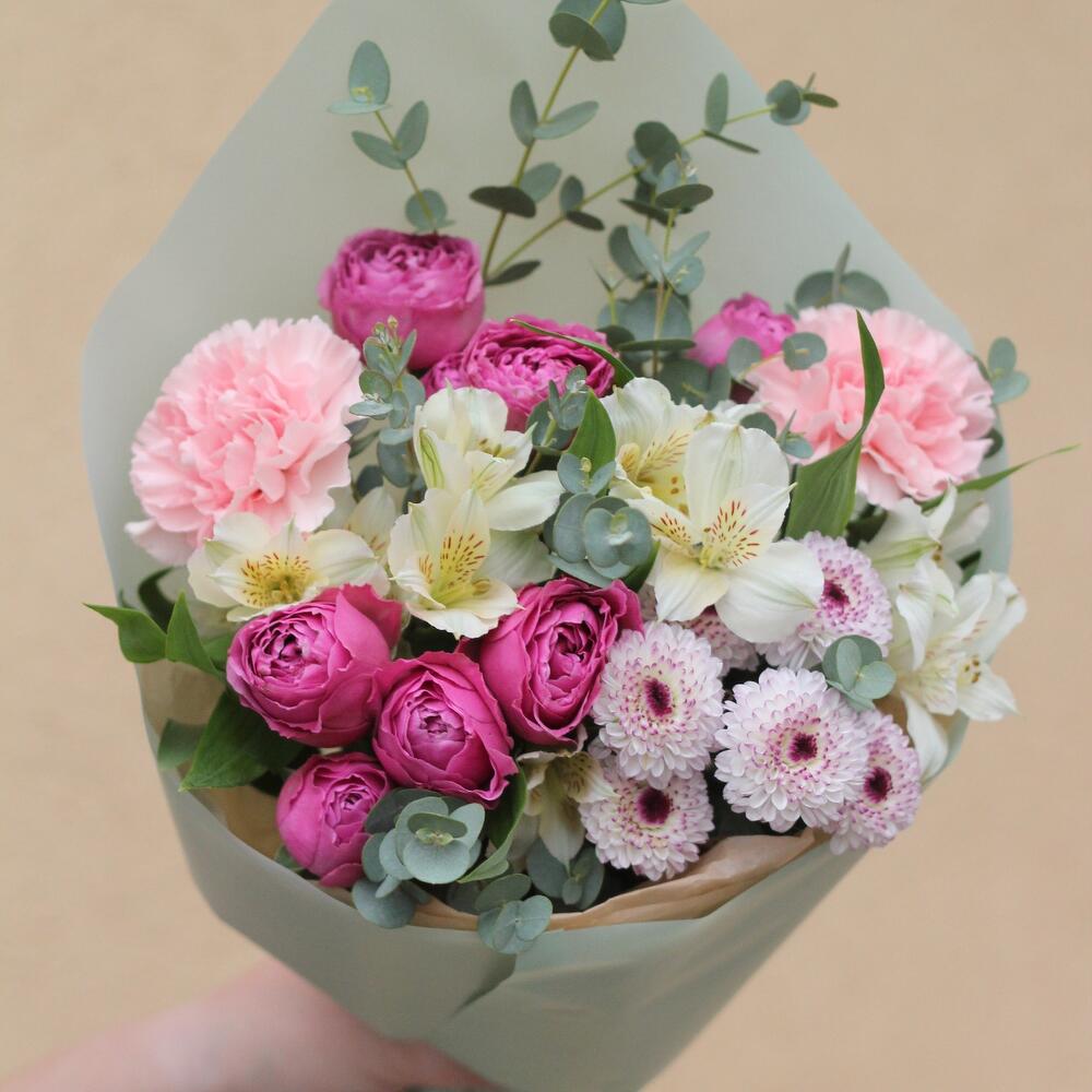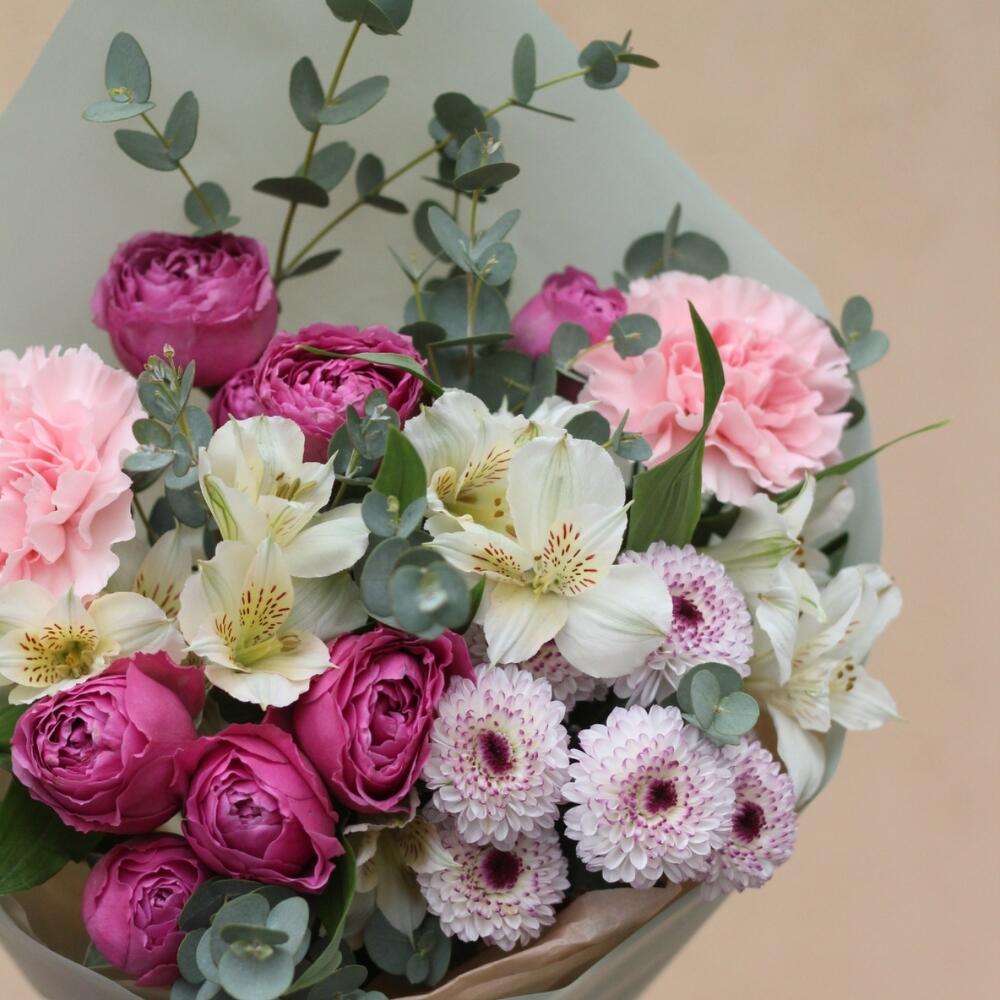 Роза пионовидная кустовая – 2 шт. Альстромерия – 2 шт. Диантус розовый – 2 шт. Хризантема Сантини – 1 шт. Эвкалипт Гунни – 3 шт.