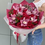 Букет Бурж с красными розами и цимбидиумом