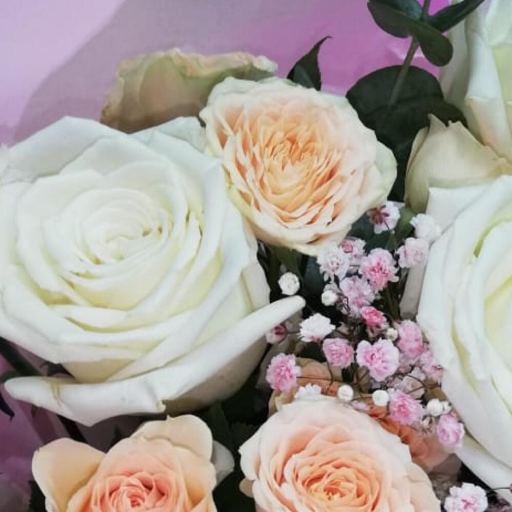 Роза кустовая – 5 шт. Эвкалипт – 3 шт. Лента атласная – 4 шт. Диантус – 3 шт. Слюда упаковка – 3 шт. салфетка декоративная – 5 шт. гипсофила радужная – 2 шт. роза плей бланка – 5 шт.