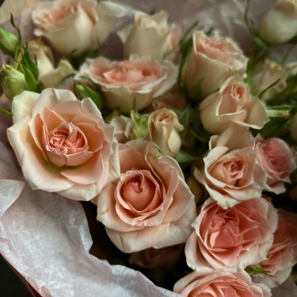 Кустовая роза – 7 шт.декоративная упаковка – 1 шт.Атласная лента – 1 шт.