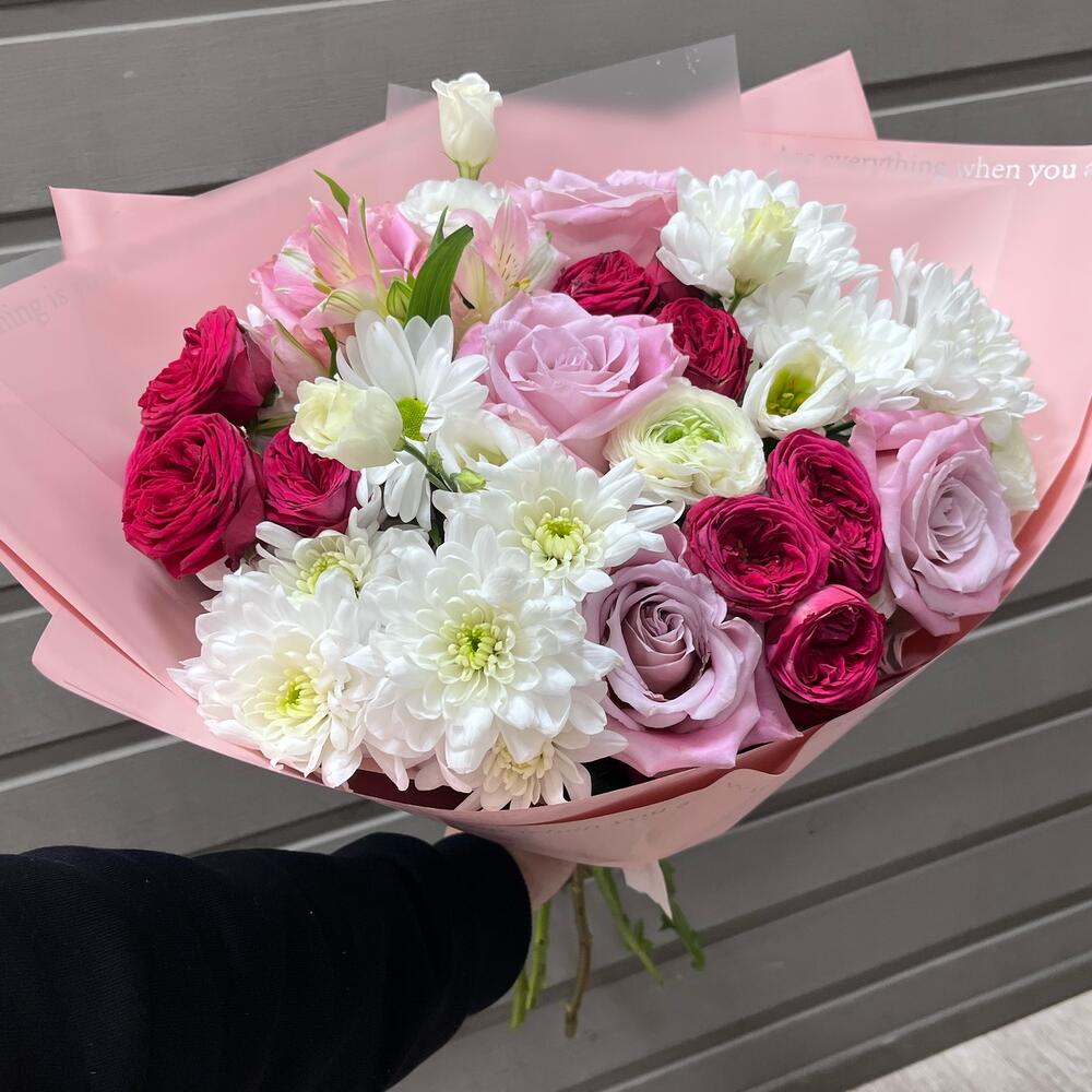 Категорий: Альстромерии, Кустовые розы, Лизиантусы, Розы, Хризантемы