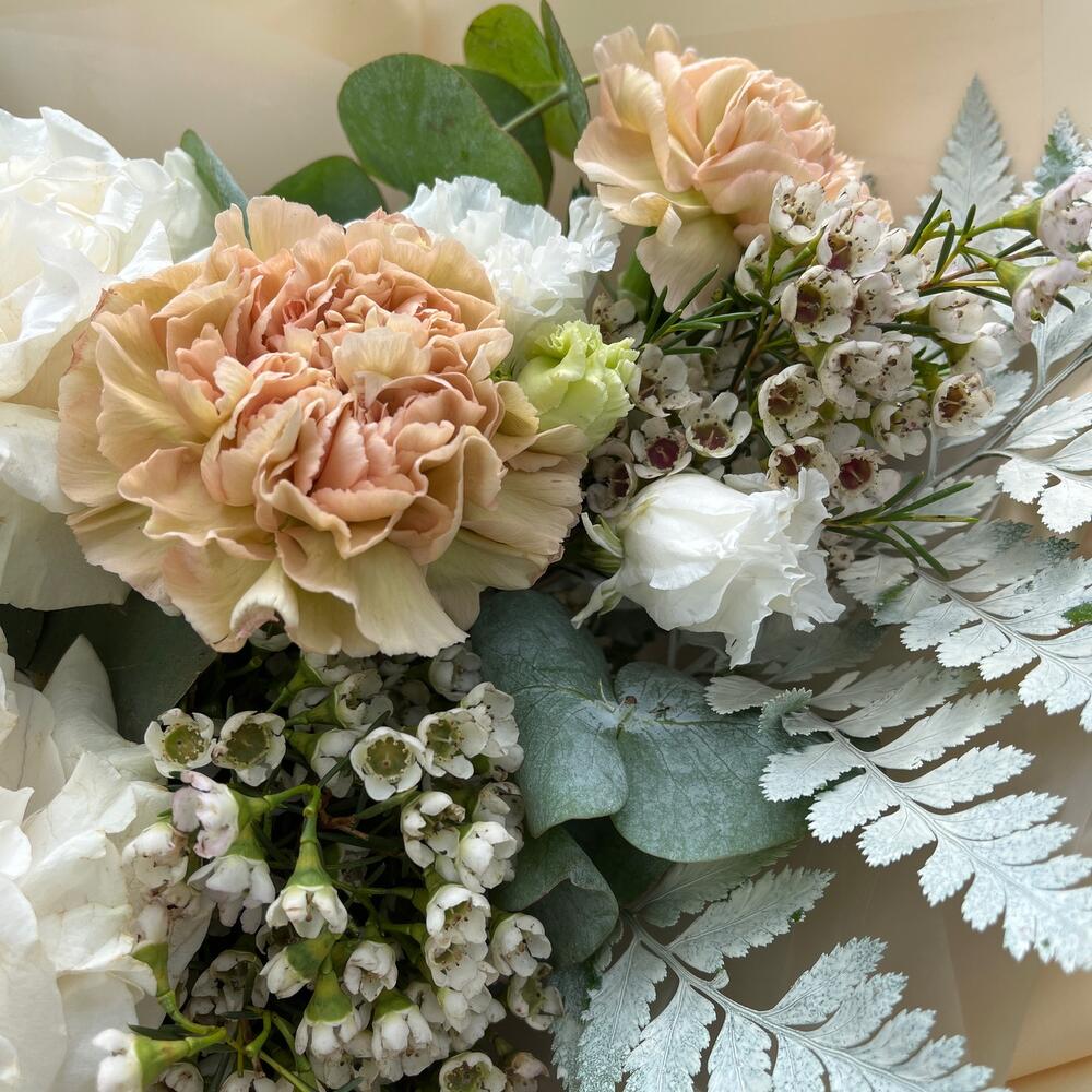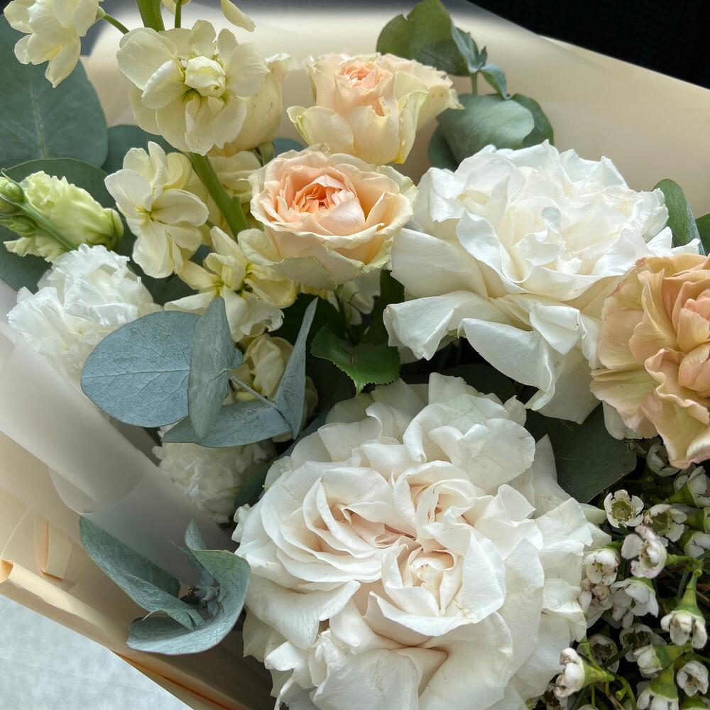 Роза пионовидная – 2 шт.Роза кустовая – 1 шт.Диантус – 2 шт.Лизиантус – 1 шт.Ваксфлауэр – 1 шт.Маттиола – 1 шт.Эвкалипт – 1 шт.Папоротник – 1 шт.Лента – 2 шт.Упаковка дизайнерская – 2 шт.