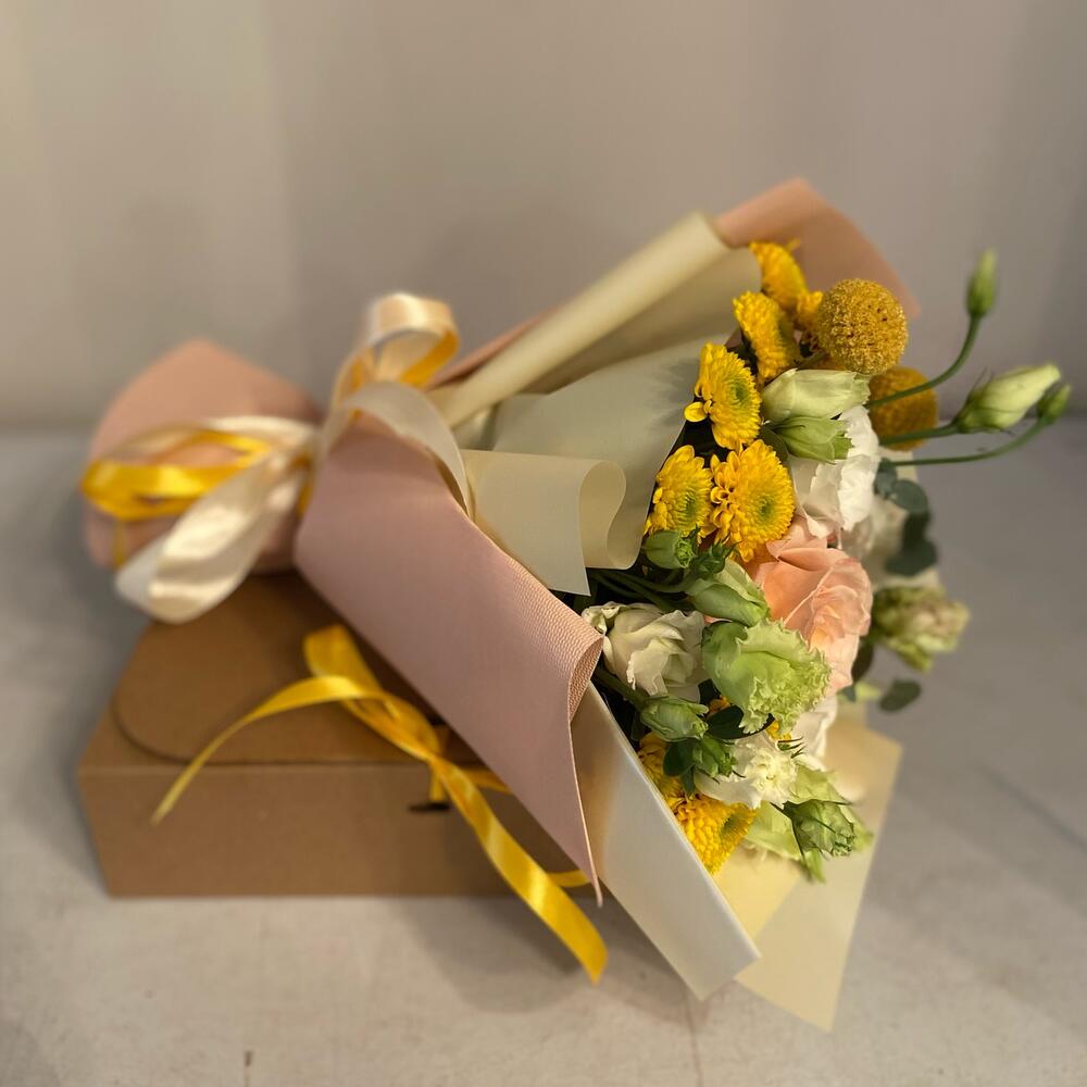 Роза садовая – 1 шт.Лизиантус – 2 шт.Хризантема кустовая – 3 шт.Краспедия – 2 шт.зелень декоративная – 1 шт.Упаковка дизайнерская – 1 шт.Лента атласная – 1 шт.Открытка – 1 шт.крафтовая коробочка – 1 шт.Эклер – 1 шт.канеле – 1 шт.ром баба – 1 шт.миндальная конфета – 1 шт.Фруктовая корзина – 1 шт.
