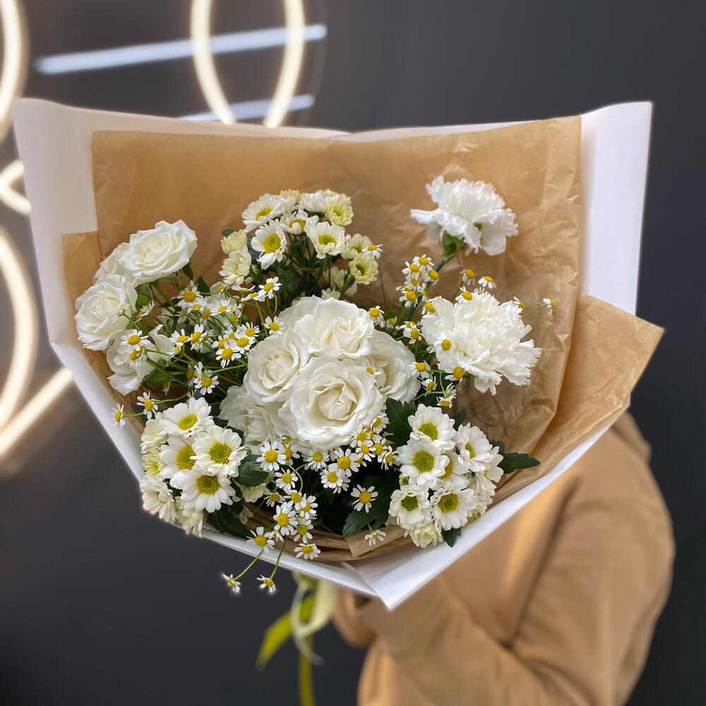 Матрикария – 3 шт.Гвоздика – 2 шт.Роза кустовая – 2 шт.Сантини – 3 шт.Фисташка – 2 шт.