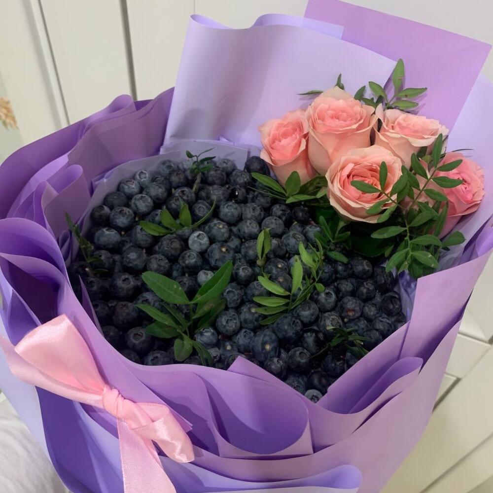 Голубика – 600 гр.Фисташка пучок – 1 шт.Дизайнерская упаковка – 1 шт.розы эквадор (60 см) – 5 шт.