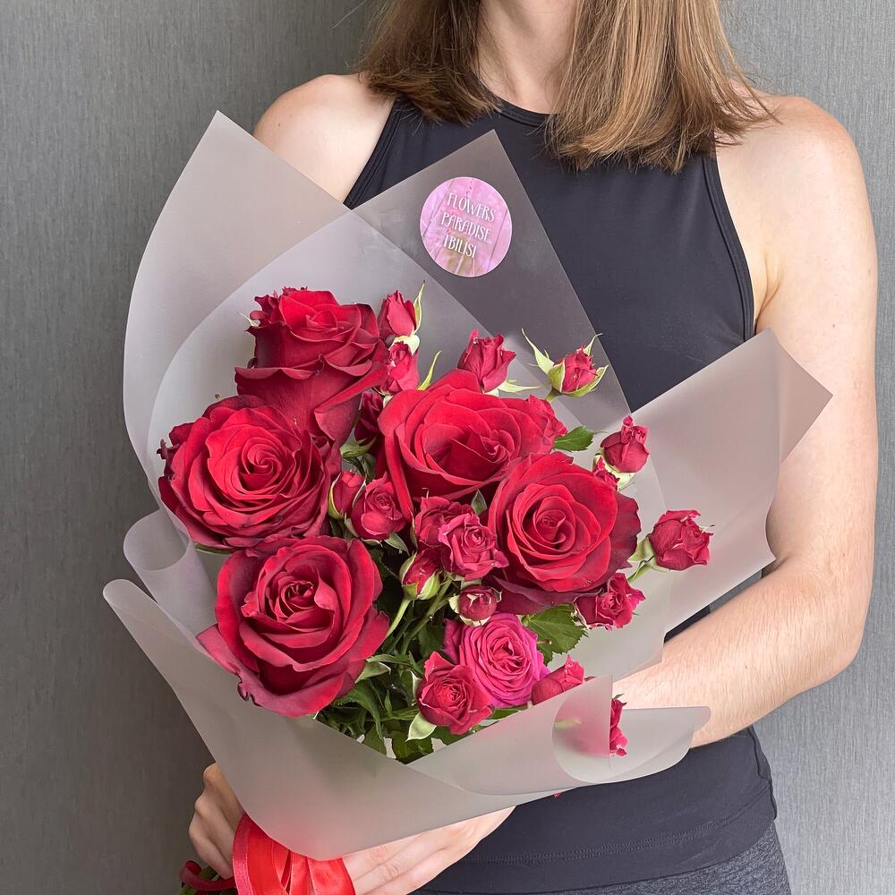 Роза одноголовая – 5 шт. Упаковка – 1 шт. Атласная лента – 1 шт. кустовая роза (ветки) – 2 шт.