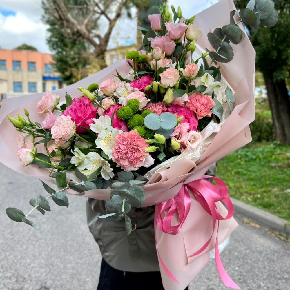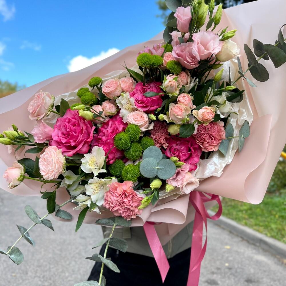 Альстромерии, Кустовые розы, Лизиантусы, Пионовидные розы, Розы, Ромашки