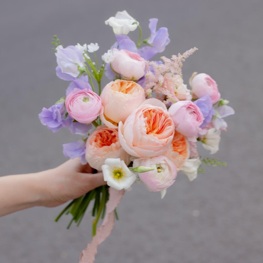 джульетта роза пионовидная – 5 шт.Латирус – 6 шт.Лизиантус – 2 шт.Ранункулюс розовый – 5 шт.Астильба – 2 шт.