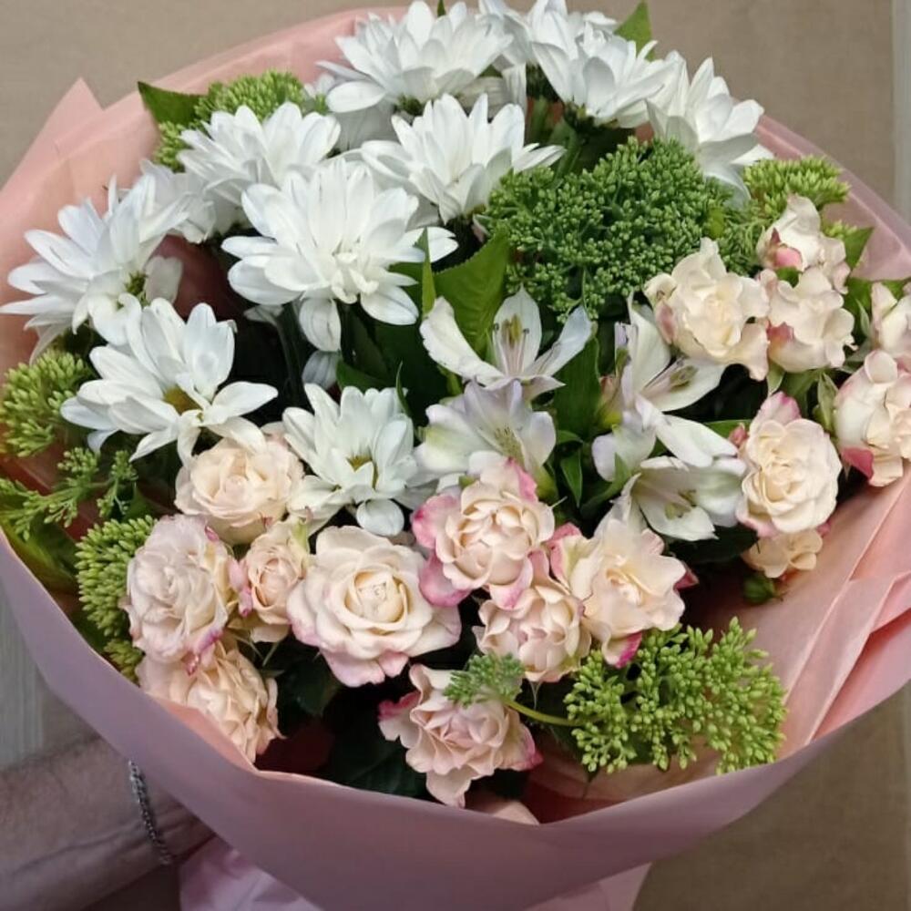 Роза кустовая – 3 шт. Хризантема кустовая – 2 шт. Альстромерия Микс Европа – 1 шт.