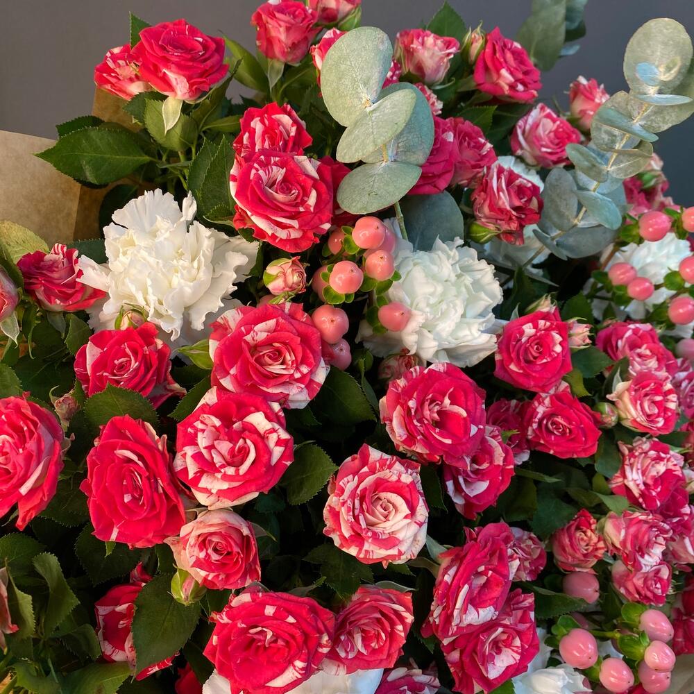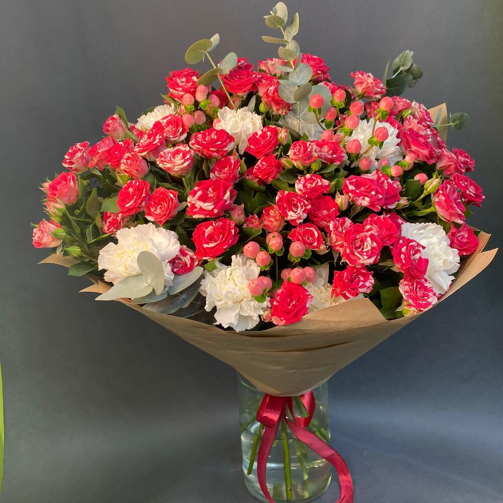 Роза кустовая – 9 шт.Лента атласная – 1 шт.Диантус – 7 шт.Крафт упаковка – 5 шт.Гиперикум розовый – 4 шт.эвкалипт ветка – 2 шт.