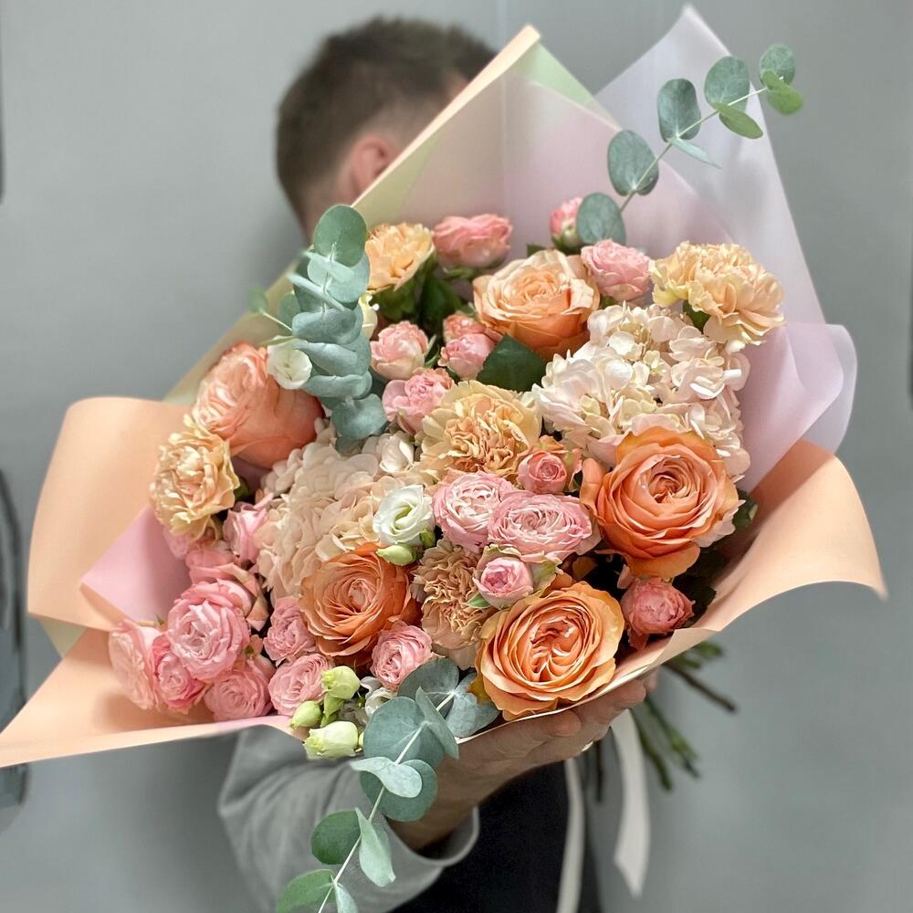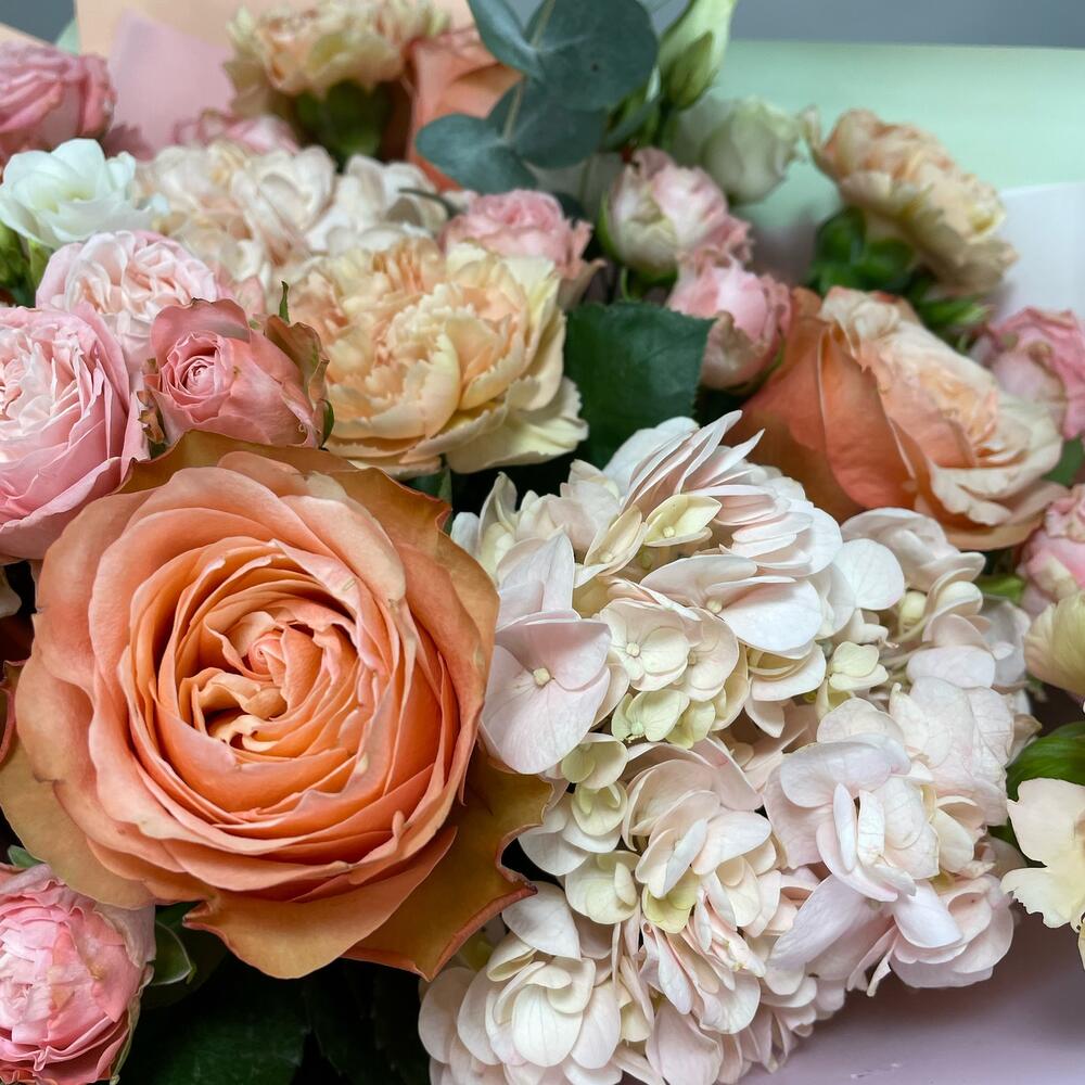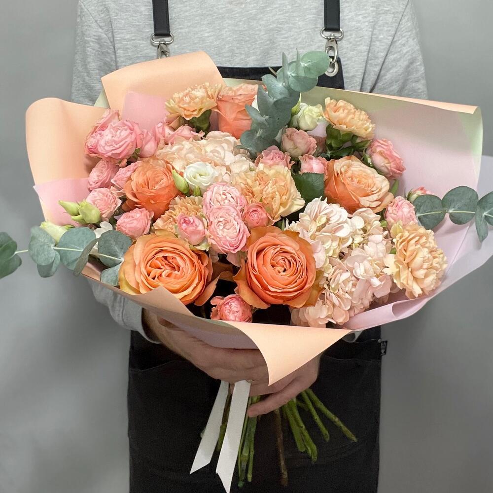 Гортензия – 2 шт.Эвкалипт – 3 шт.Эустома – 3 шт.Диантус – 5 шт.Роза пионовидная – 5 шт.Кустовая пионовидная роза – 7 шт.Упаковка дизайнерская – 4 шт.зелень декоративная – 3 шт.