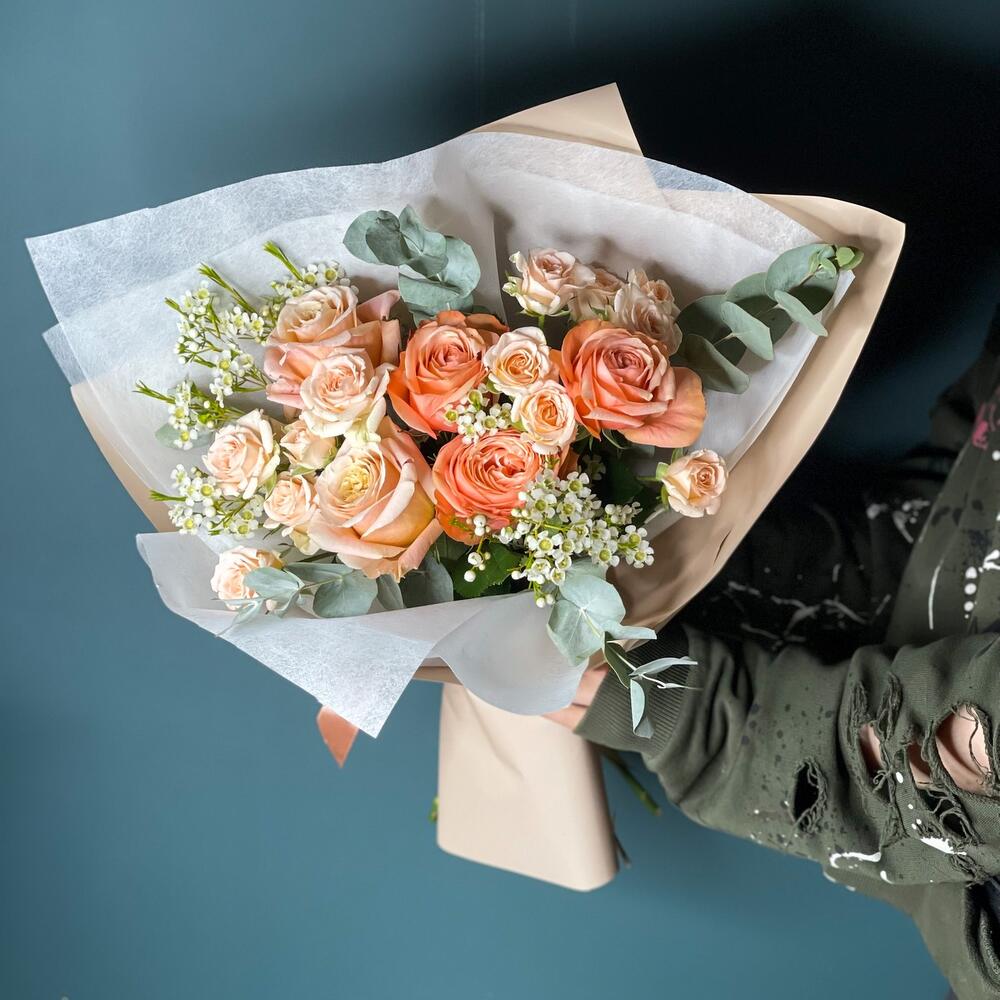 Ваксфлауэр – 2 шт.Лента – 1 шт.Роза кустовая – 2 шт.Эвкалипт – 1 шт.Роза одноголовая – 5 шт.бумага упаковочная – 2 шт.