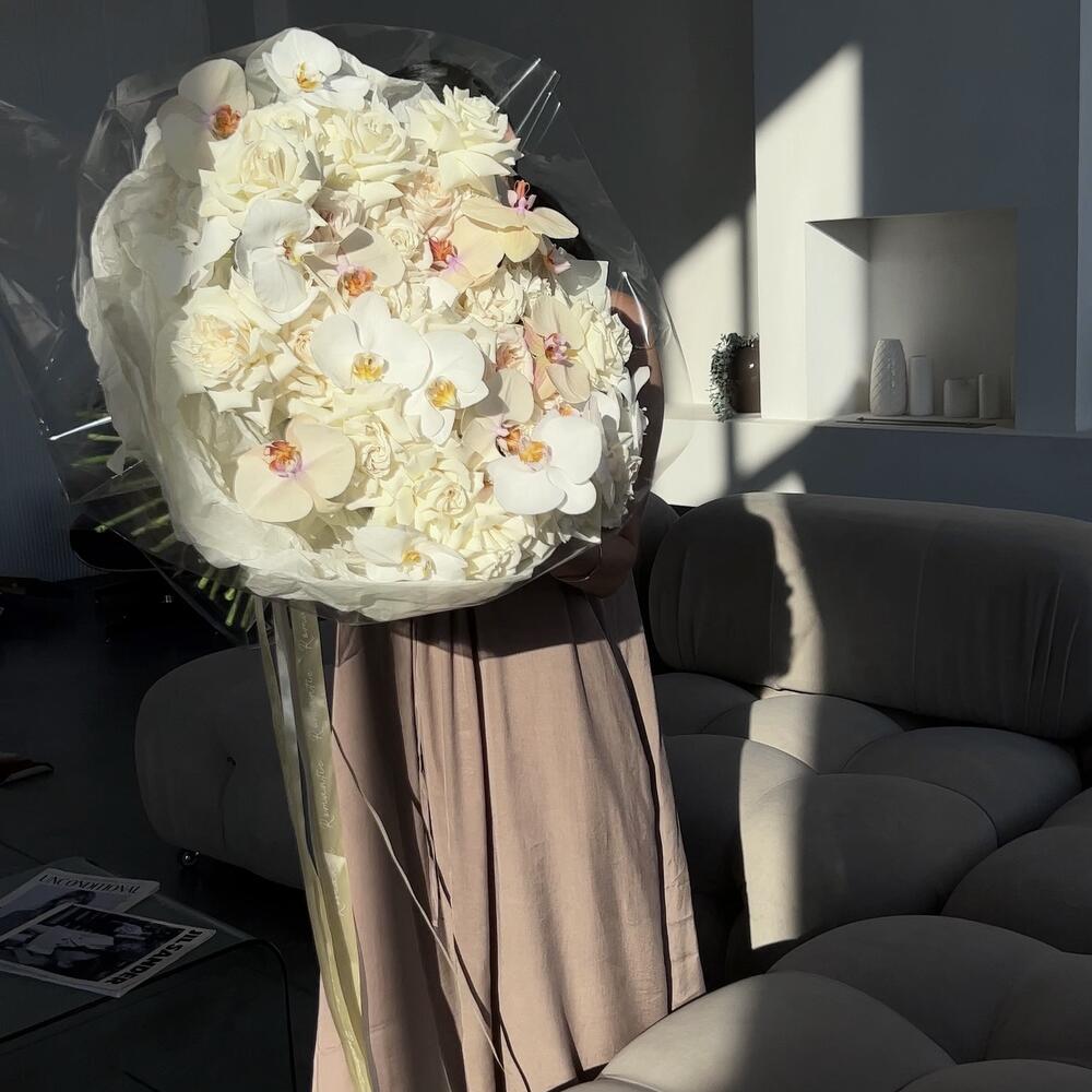 роза пионовидная плая бланка – 36 шт.Орхидея Фаленопсис – 19 шт.тишью кремовое – 1 шт.Слюда – 1 шт.открытка брендированная в подарок – 1 шт.