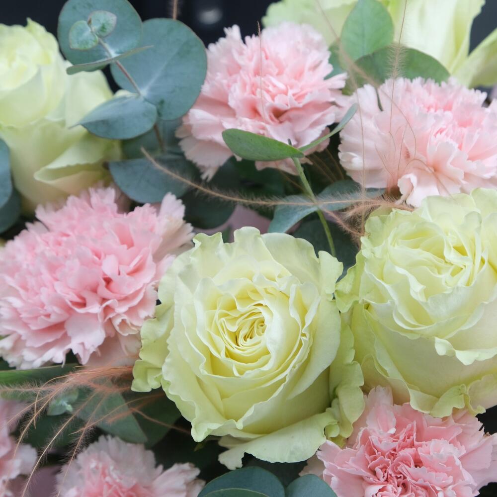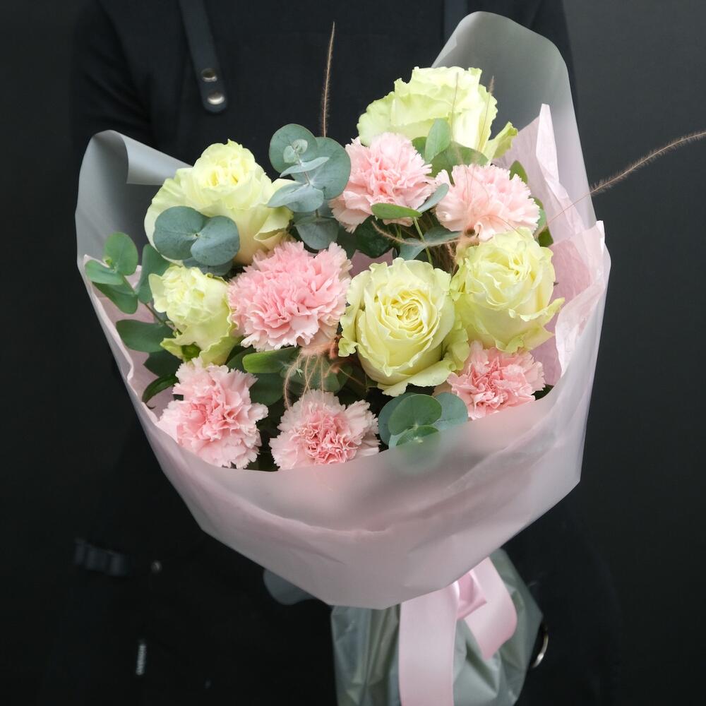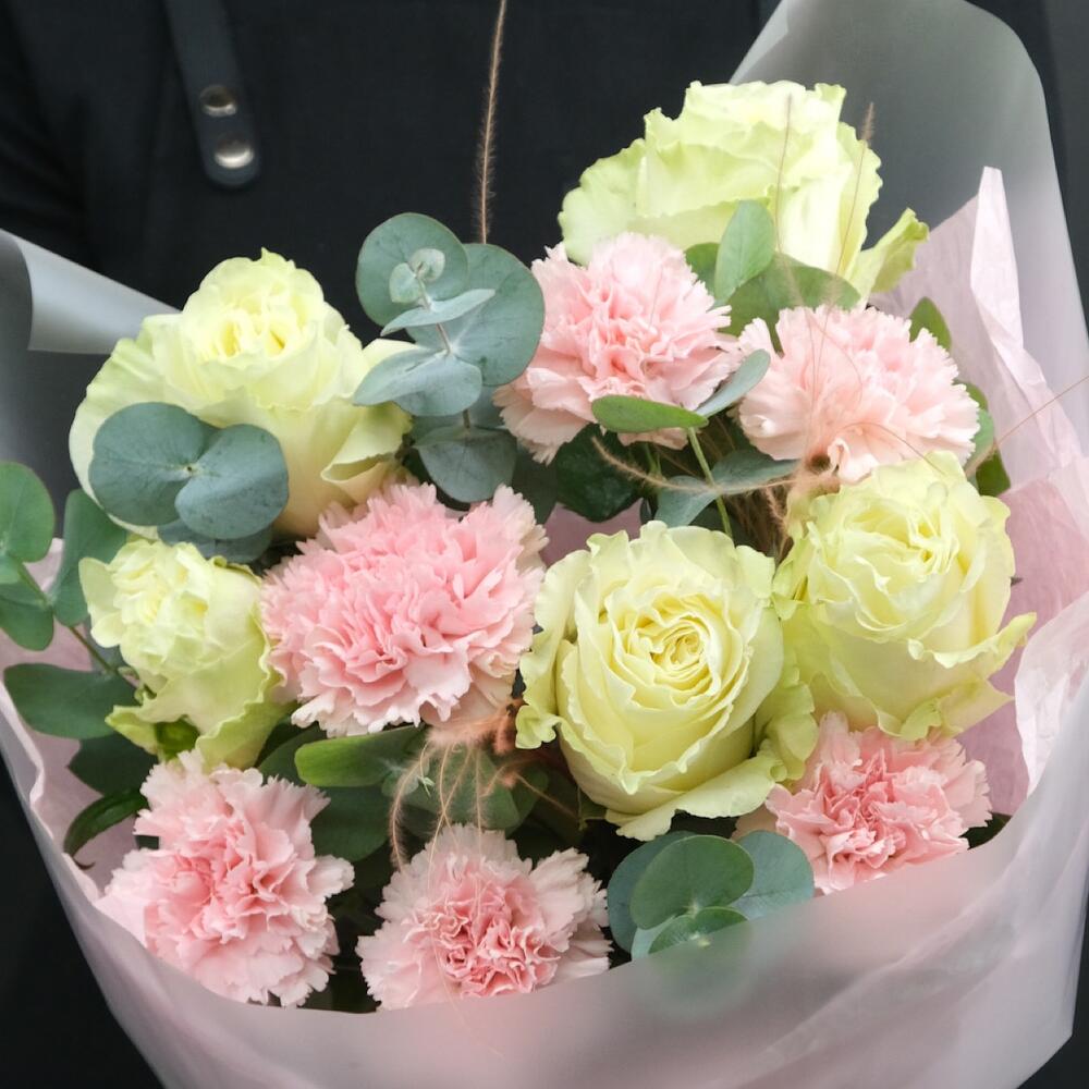 Букет с розами Moonstone и розовыми диантусами