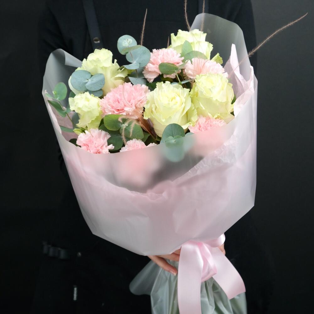 Эвкалипт – 1 шт.Роза – 5 шт.Упаковка – 1 шт.Диантус – 6 шт.Стифа – 2 шт.Инструкция по уходу – 1 шт.подкормка для срезанных цветов – 1 шт.