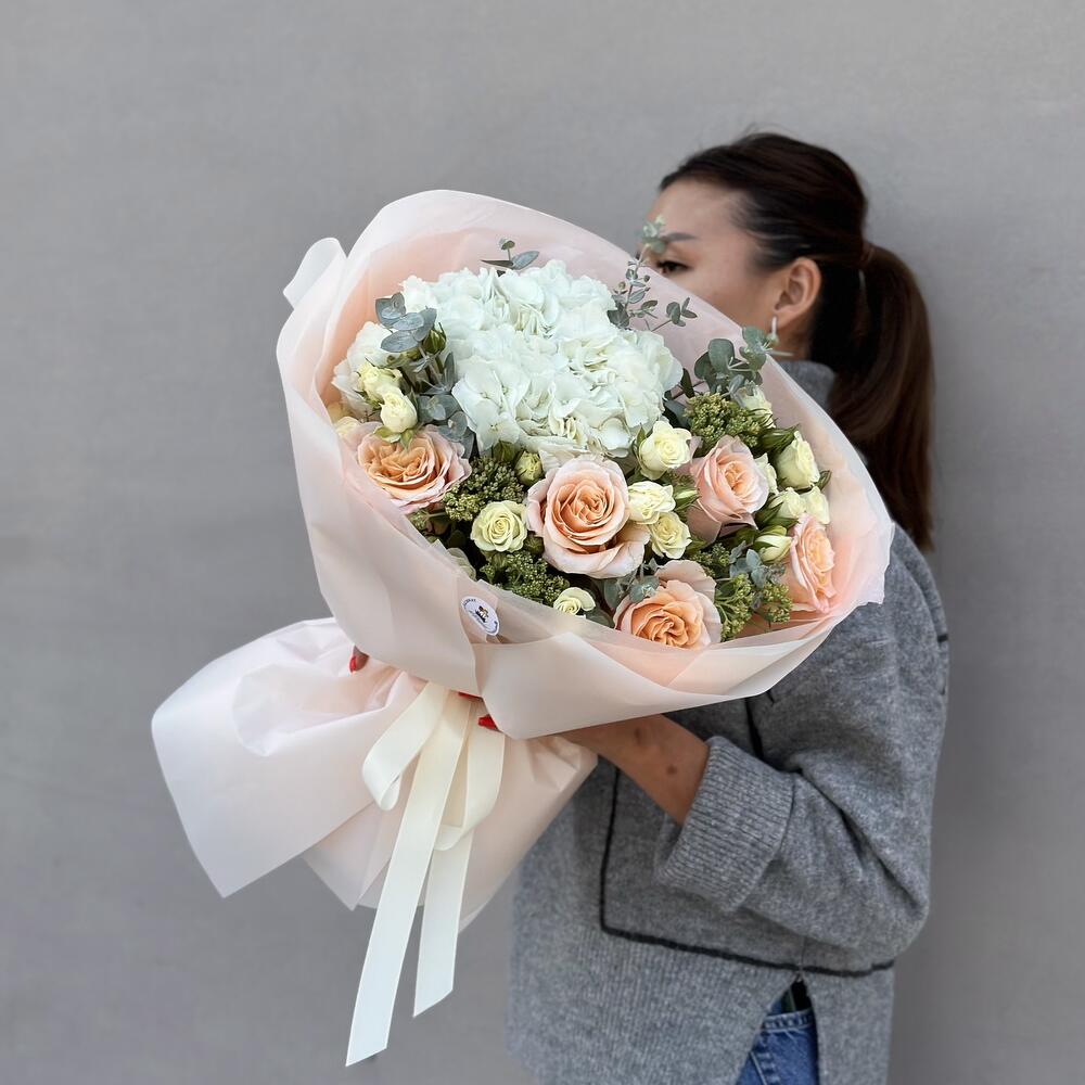 Альстромерии, Гвоздики, Кустовые розы, Лизиантусы, Розы, Хризантемы
