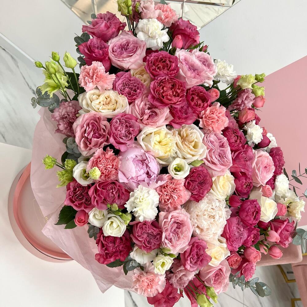 Роза пионовидная – 39 шт.Лизиантус – 12 шт.Пион – 4 шт.Диантус – 9 шт.Кустовая роза – 12 шт.Эвкалипт – 5 шт.Шляпная коробка – 1 шт.